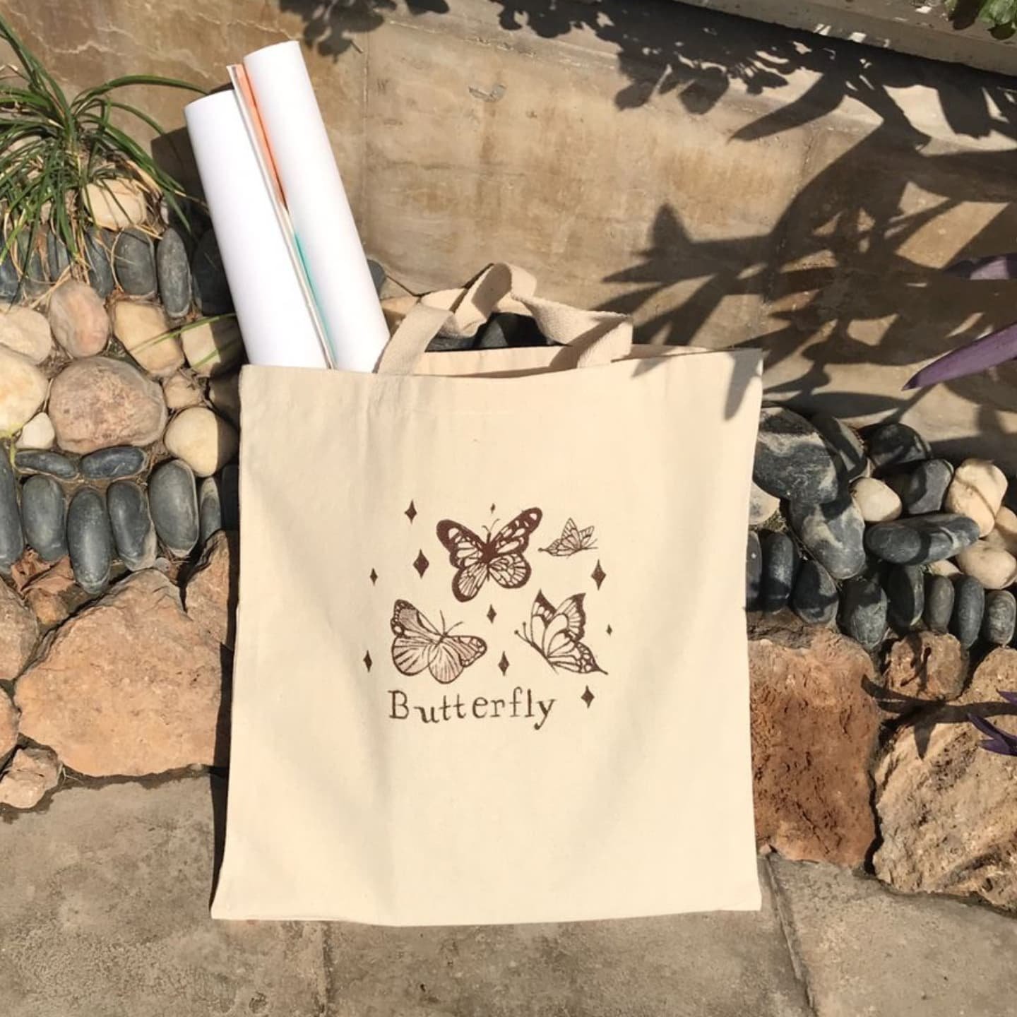 Flutter into style with this “Butterfly Bliss” beige tote bag! Adorned with a delicate design of three butterflies and the word “Butterfly” in a whimsical font, this bag brings a touch of nature to your daily essentials. Made from durable material, it’s perfect for carrying art supplies, books, or groceries while adding a charming aesthetic to your look.