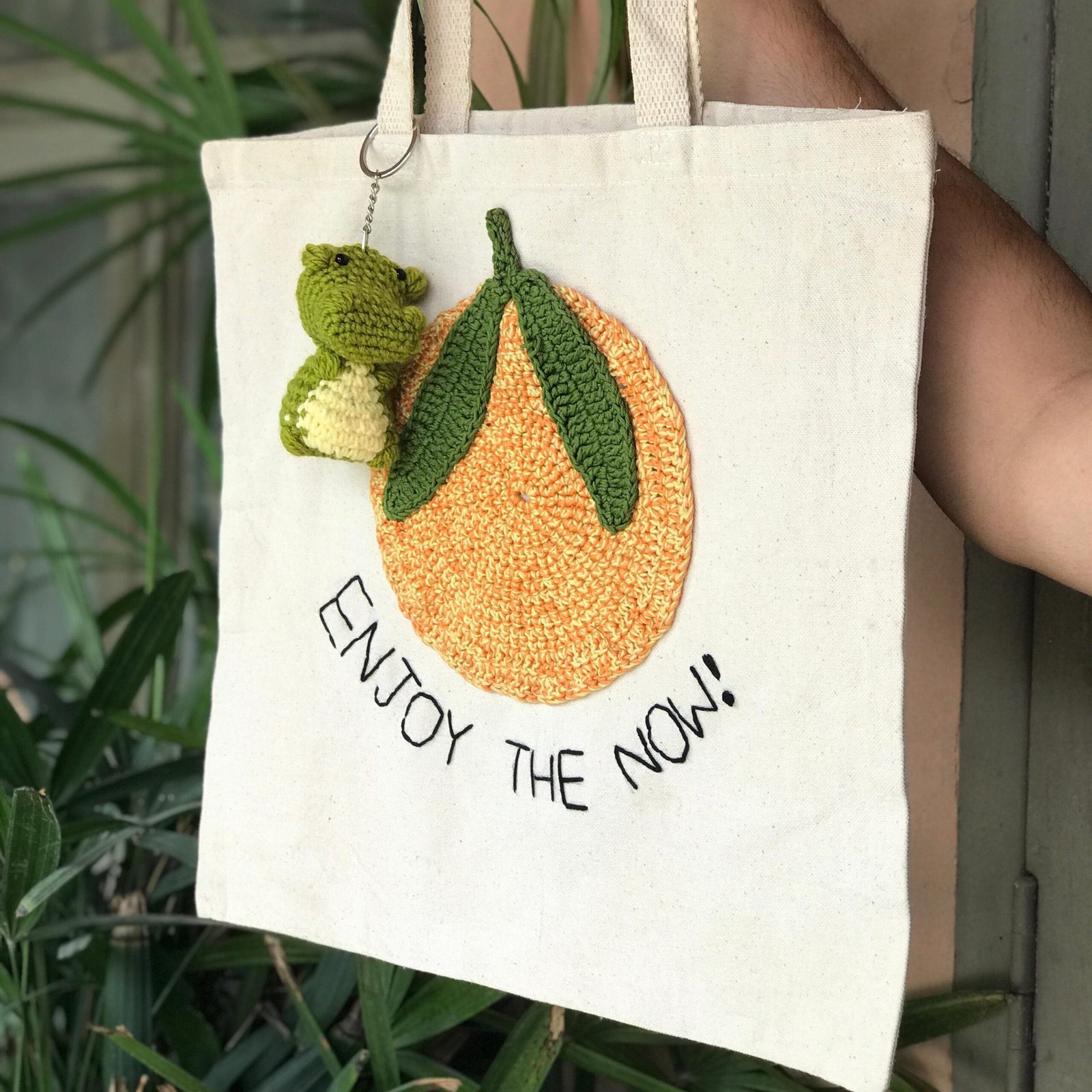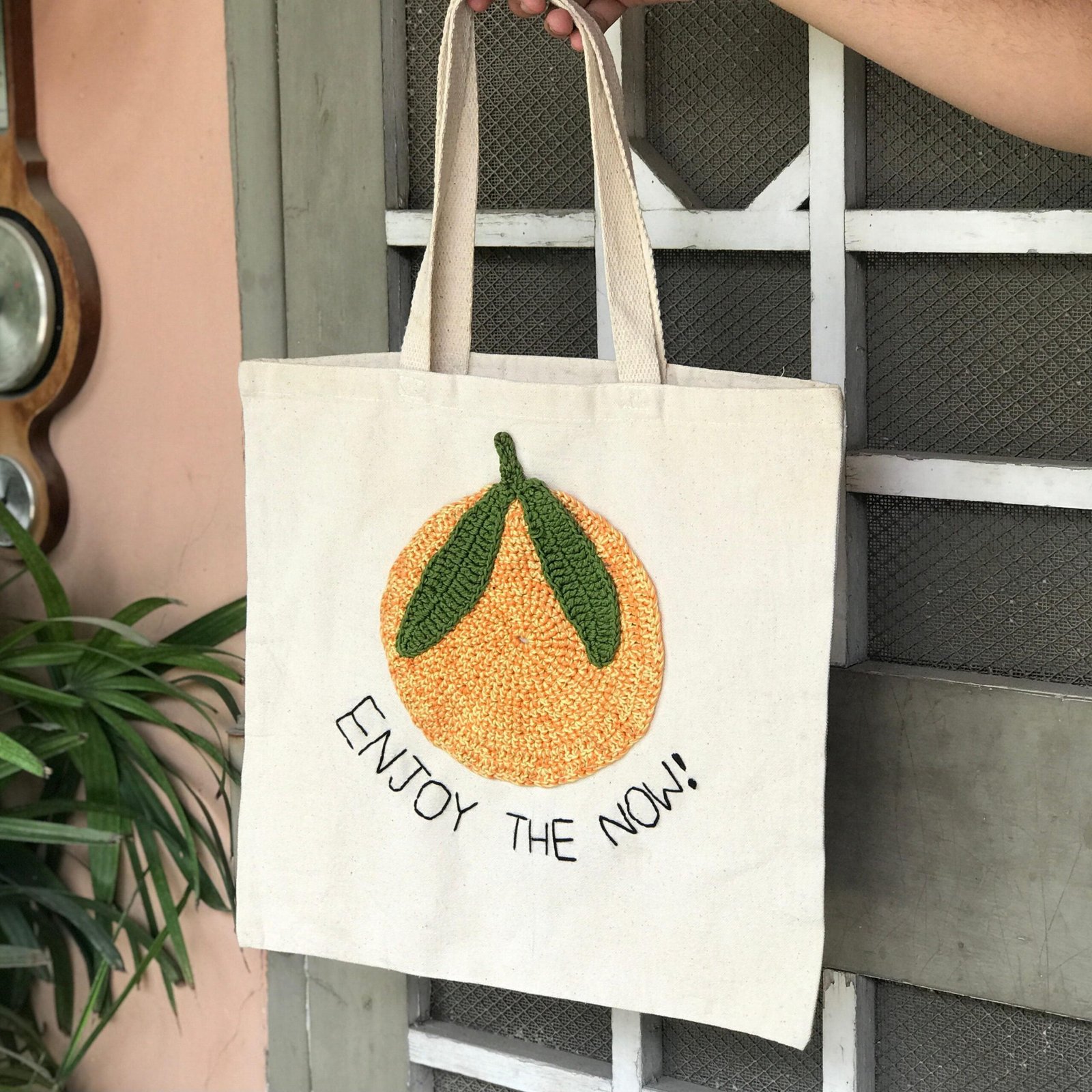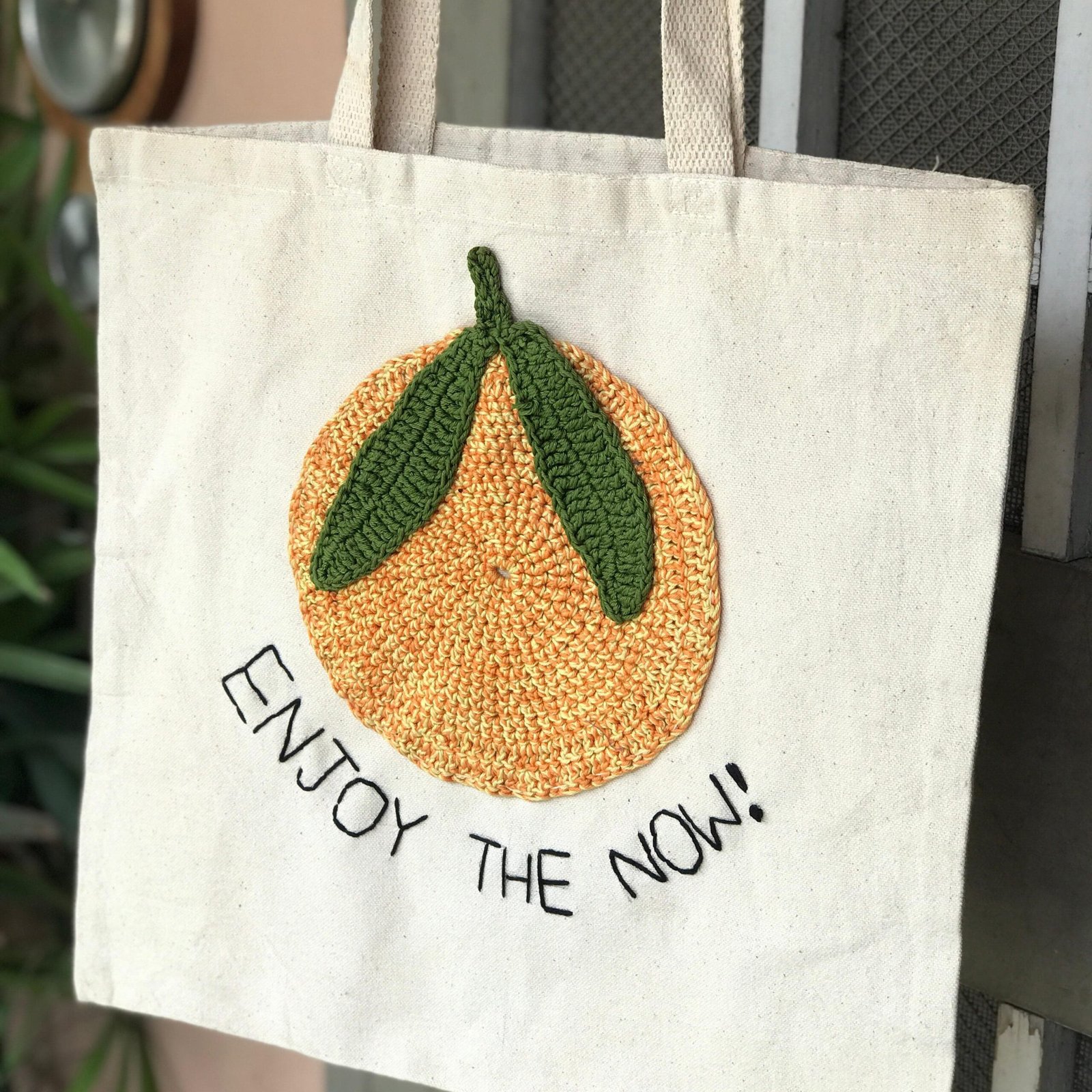 + Free ShippingBrighten your day with this hand-embroidered tote bag featuring a vibrant crocheted orange and the uplifting message “Enjoy the Now!” on a natural cotton base. Perfect for carrying your essentials, this eco-friendly bag adds a cheerful touch to your outings.